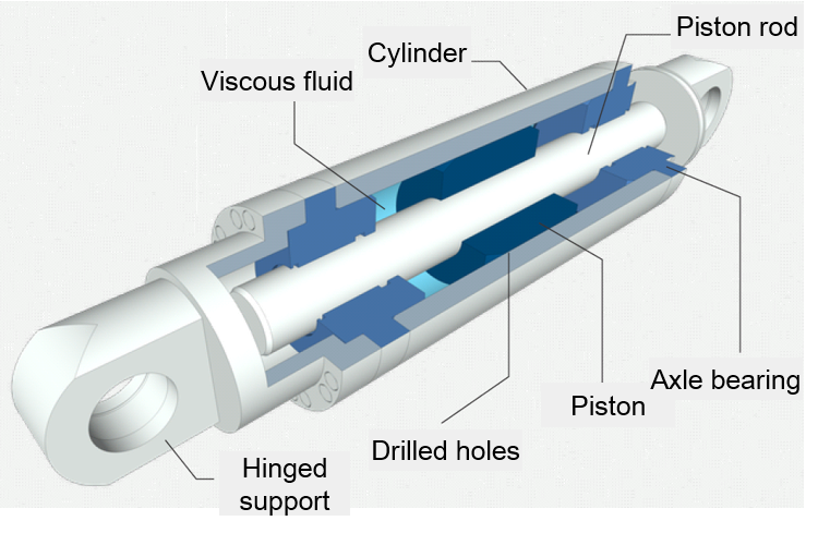 Fluid viscous damper (FVD) is a velocity dissipating device. Its structure is an incompletely closed cylinder with piston, transforming force into heat to dissipate. The damping force comes from the viscous fluid's inertia and unbalanced pressure, expressed as